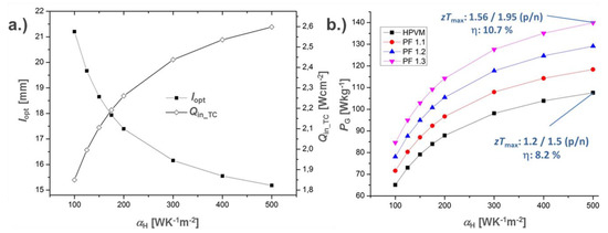 Increasing αH from 100 WK−1m−2 to 500 WK−1m−2 at the hot side yields a reduction of the optimal leg length for thermal resistance match, and in turn leads to an increase of the incident heat flux (Figure 7a). The lower mass translates into a higher gravimetric power density, which is likewise achievable by an assumed increase of the PF (Figure 7b).