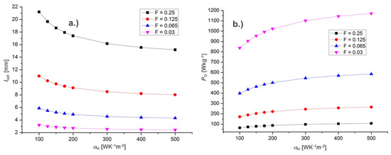 Increasing the surface for the convective heat exchange per thermocouple on both sides effectively decreases the thermal resistance of the convective boundary layers. The lower F yields the reduction of the optimal leg length for the matching of thermal resistances (Figure 8a), which allows for a significant mass reduction (Figure A3).