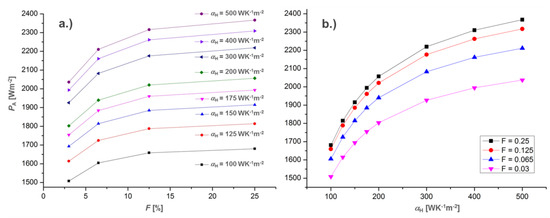 Areal power density PA as a function of the filling factor F for different HTC αH (a). Converted data of PA in dependence on αH for different F (b).