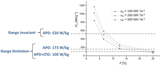 Lowering the filling factor F yields high mass savings due to significantly lowered thermal resistance of the convective boundary layers and reduced optimal leg lengths of the thermocouple. Reducing F from 25% to 3% reduces the thermocouple mass by 43% (Figure A3). At the design point of the convection HTC parameters at the nozzle (αH = 100 WK−1m−2, αC = 64 WK−1m−2), the minimal gravimetric power density requirement (“APD + CFD”-limit) is fulfilled for the HPVM for F < 21% (Figure 10). When considering only the positive impact on the reduced mass and mechanical power of the engine generator (“APD”-limits), a beneficial installation of TEG becomes attainable for F < 12.4%, while access to a range-invariant TEG implementation is given for F < 5.5%, respectively. Improving the hot side convective HTC to αH = 200 WK−1m−2 the power density requirements are fulfilled for slightly higher F. PG = 100 Wkg−1 is attainable for F < 23.8%, while the range-invariant installation requires F < 6.3%. According to the simulation results, the range for maximum gravimetric power density at F = 3% is given between 800 Wkg−1 and 1200 Wkg−1 in dependence on αH.