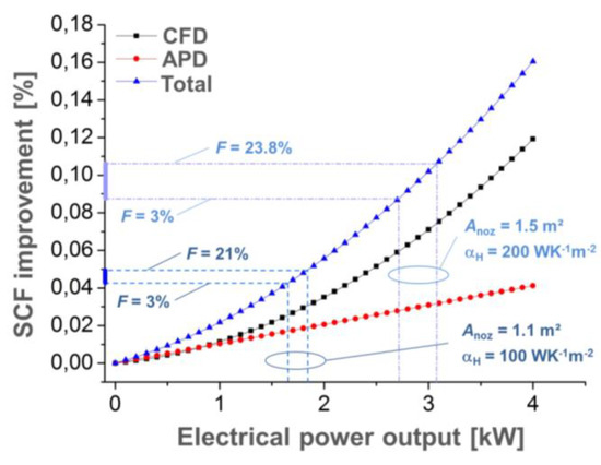 Specific fuel consumption (SFC) improvement as a function of electrical power output of the TEG at the aircraft nozzle. The SFC is calculated on the base of data from [28]. Contributions from the bypass acceleration (CFD) and the reduced mechanical power of the generator (APD) add to the total SFC reduction. Ranges of SFC improvement are highlighted for two different occupation surfaces at the nozzle with varied HTC αH. The corresponding values of the electrical power output are calculated according to the respective areal power densities for the permitted ranges of F, which fulfil the minimum gravimetric power density requirement.