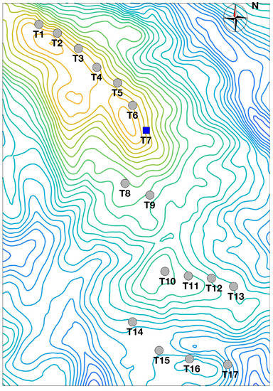 The wind farm under investigation has recently attracted some attention in the wind energy scientific literature because it is an interesting test case for the study of wind flow, wake–terrain interactions and wind turbine performances in complex terrain [,]. In particular, it has been one of the test cases of the International Energy Agency project about wind flow over complex terrain at the microscale level [].