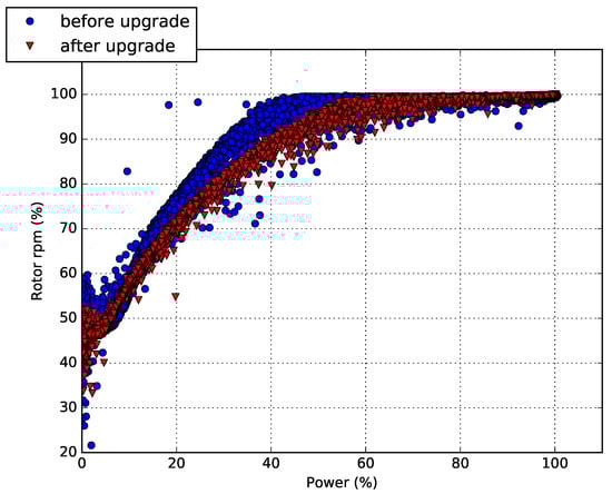 In Figure 2, the power–rotor rpm curve for, respectively, the data sets and is reported. The difference between the two is appreciable: After the upgrade, a lower rotational speed was needed to extract the same amount of power as before the upgrade.