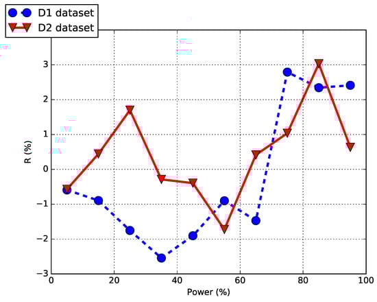 In Figure 3, for a sample selection of D1, the sets and are plotted after being averaged in intervals of 10% of the rated power.