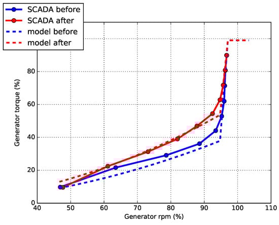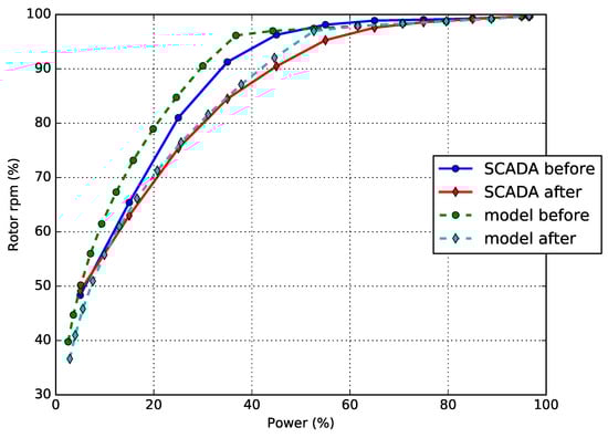 Figure 3 is consistent with the intuitive expectation about the upgrade of interest: The effect of the upgrade is visible below rated power (i.e., before the rpms saturate) as a change in the mean difference between measurements and model estimates. When the rpms saturate, approaching rated power, the residuals between model estimates and measurements have a similar behavior because the upgrade is not effective.