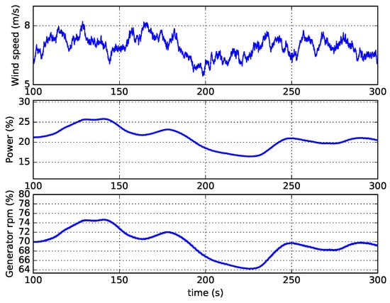 Each run of the model simulates 400 s with a time step of the millisecond: In Figure 5, examples of wind intensity, rotor rpm, and power time series are reported.