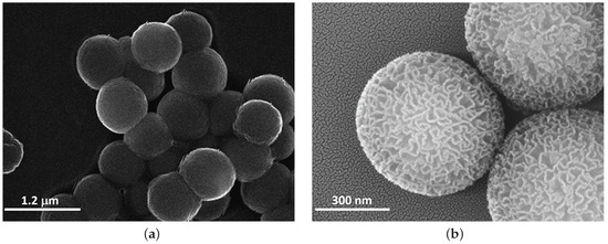 The low magnification SEM image of the synthesized silica KCC-1 nanoparticles showed a spherical morphology with particles sizes of about 600–700 nm (Figure 1a). The high magnification FEG-SEM image, Figure 1b, highlights the well-developed wrinkle morphology and high porosity characteristics of KCC-1.
