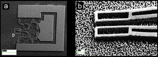 Figure 4 shows tilted SEM images (a) of a gripping device sample between the process of structure patterning and the releasing phase, with an enlargement (b) of the jaw-tips. The displayed device has n-doped a-Si:H (hydrogenated amorphous silicon), deposited by Plasma-Enhanced Chemical Vapor Deposition (PECVD), as the structural layer.