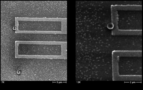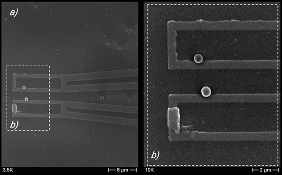 At the end of each fabrication process, the device geometry is transferred to the chip by means of electron beam lithography. The geometry is copied on nine different positions, and therefore, nine device samples are available. As explained in the previous Section 3.2, the device is still attached to the bottom layer and appears as in Figure 5. This circumstance is quite convenient for preliminary studies, because the presence of a bottom layer makes the deposition of particles in contact with the device easier.