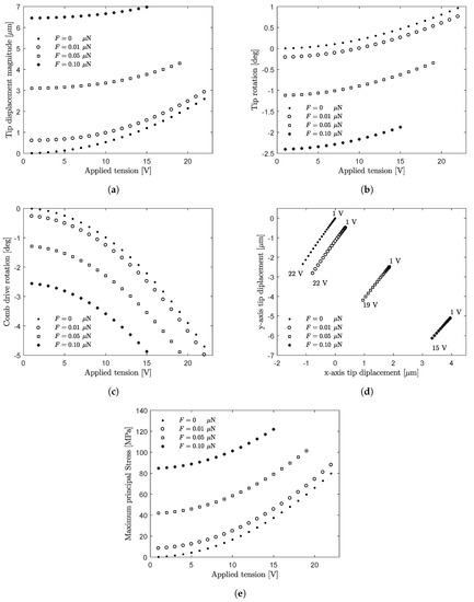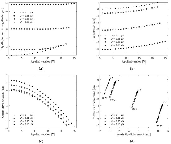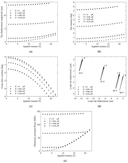 - the applied tension required to achieve the maximum rotation of the comb-drive decreases (from 22 V for to 19 V for μN, Figure 10c);