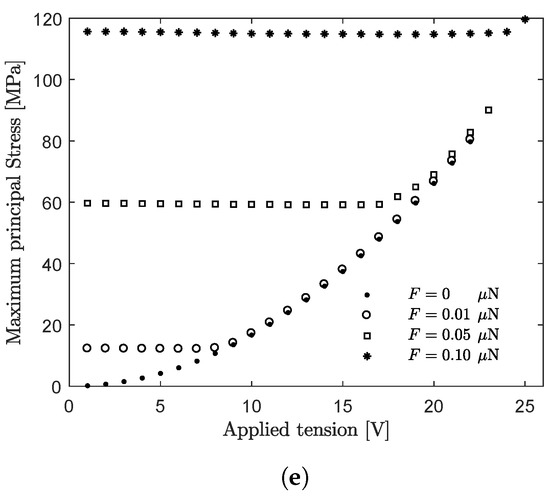 - the maximum principal stress increases for all the applied tension values only for the highest value of the force magnitude ( μN). The force magnitudes μN and μN give the predominant contribution to the MPSuntil the applied tension does not exceed about 20 V and 9 V, respectively (Figure 8e).
