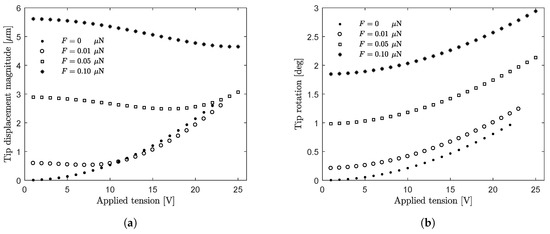 - the tip displacement magnitude increases (Figure 8a); only for the lowest value of the force ( μN) and for high tension values (>20 V), the tip displacement magnitude is close to the case ;