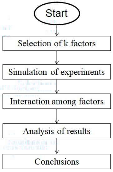 This study uses the following complete factorial design methodology whose flow diagram is shown in Figure 1. First, a set of interest factors is defined, determined by two critical levels (−1 and 1), for each one the them, which represent extreme values of said factors, i.e., values for the best and worst simulation scenario. Then, the experiment is run for all the possible combinations of factors. From each simulation two-factor interactions are extracted, three-factor interactions, and so on. Finally, using the sign table method the results are analyzed and the variation is assigned, depending on the combination of the different factors. A factor’s importance depends on the proportion of the total metric variation explained by the factor. The variation refers to the variance of a metric []. The total variation of is known as the total sum of squares (SST), which is calculated using Equation (18).