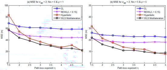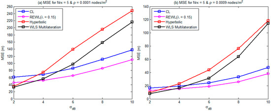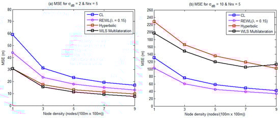 Figure 2 shows the performance graphs of the MSE as the path-loss exponent varies. Figure 2a shows that the Hyperbolic and Multilateration range-based algorithms show greater MSE variation than the range-free algorithms, considering a noise level , a node density and 5 RNs. Figure 2b shows an increase in the node density and the same behavior is seen in Figure 2a. Consequently, the path-loss exponent factor shows greater impact on the range-based algorithms than on the CL and REWL range-free algorithms. According to the log-normal shadowing model, the greater the path-loss exponent, the less the RSS value is affected by the Gaussian random variable , meaning that this factor has less impact on the RSS between the NOI and the RNs than on the distance separating the NOI and the RNs, which is observed using Equation (20), i.e., the error of the actual and estimated distance between the NOI and the RNs is greater than the error from the actual RSS to the estimated RSS between the NOI and the RNs. Therefore, greater localization error variation can be seen in the range-based algorithms than in the range-free algorithms, as shown in Figure 2.