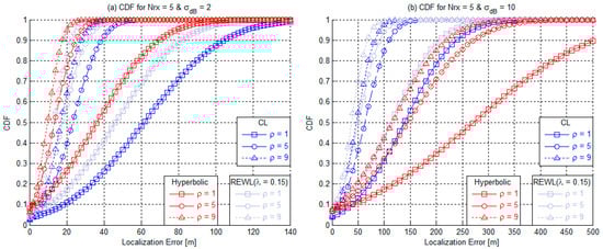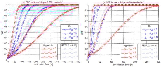 Figure 4 shows the CDF behavior of the localization techniques. As shown in Figure 4a,b, the greater the node density, the greater the CDF value of the localization techniques. Figure 4a shows that the node density has greater impact on the CL and REWL range-free algorithms considering a small noise level , since these algorithms show greater CDF variation for different node densities. In Figure 4b the noise level increases to for different node densities , and the noise level has greater impact on the Hyperbolic algorithm, since this algorithm shows greater CDF variation here than in Figure 4a.