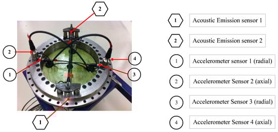 A detailed sketch of the location of four accelerometers and two AE sensors on slew bearing.