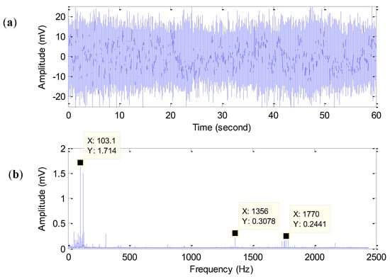In steel making industries, slew bearings are operated in dusty environments. Typical micro size particles from coal as the energy source in the industry are visually found inside the bearing when the bearing is dismantled from the rig during the maintenance work. In this study, the coal dust is inserted into the slew bearing to accelerate the failure in mid-April (58 days from the beginning). An example of the original vibration signal is presented in Figure 3a. The signal is collected before the final failure on 1 September. It can be seen from Figure 3b that the signal is dominated with unknown high frequency signals. None of these frequencies are associated with bearing fault frequencies. According to the FFT result, some degradation parameters, namely features, are necessary to quantitatively monitor the bearing condition, especially to identify when the impending damage occurs.