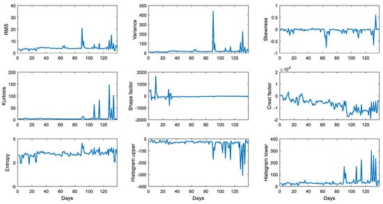 Nine time-domain features (i.e., RMS, variance, skewness, kurtosis, shape factor, crest factor, entropy, histogram upper, and histogram lower) are extracted from four sets of vibration data collected in 139 days. The example plot of nine features from accelerometer #1 (radial) is presented in Figure 4. It can be seen from Figure 4 that not all features represent the degradation condition of the slew bearing. Kurtosis, variance, and histogram lower features are more sensitive to the bearing condition than the other six features. Focusing on the RMS, variance, kurtosis, and histogram upper and histogram lower features, they show a sudden peak on day 90. This is due to the fact that coal dust has been inserted into the bearing (on day 58) and the roller and raceway have an incipient defect.