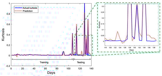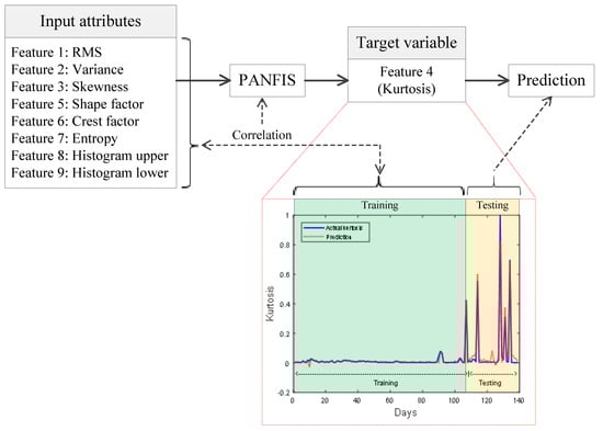 The direct mode prediction aims to study the correlation among input features, where eight features are used as the input attributes to predict the trend of input attributes. For instance, the kurtosis is made the target variable, while the other eight features serve as the input attributes to guide the predictive analytics. A schematic illustration of kurtosis feature prediction based on the PANFIS direct mode method is presented in Figure 6. This simulation aims to illustrate the descriptive power of input attributes to indicate the degradation of the slew bearing. Another goal is to model the characteristic of an input attribute based on its nonlinear relationship with the other eight input features. The 139 data points are partitioned into two groups: training and testing, where 108 samples are reserved for the training samples, while the rest are fed to test the model. In other words, prediction or testing is done for a one-month period. Figure 7 pictorially exhibits the predictive trend of PANFIS in modelling the kurtosis feature under the direct mode prediction. It is shown that the kurtosis feature characterizes a nonlinear, uncertain, and non-stationary nature; however, PANFIS is able to predict accurately. This scenario was carried out for all nine input attributes. PANFIS’s performance is examined based on its generalization power for the testing samples. It is worth noting that under the direct mode, one can observe the generalization power of PANFIS because the model is fixed after 108 days.