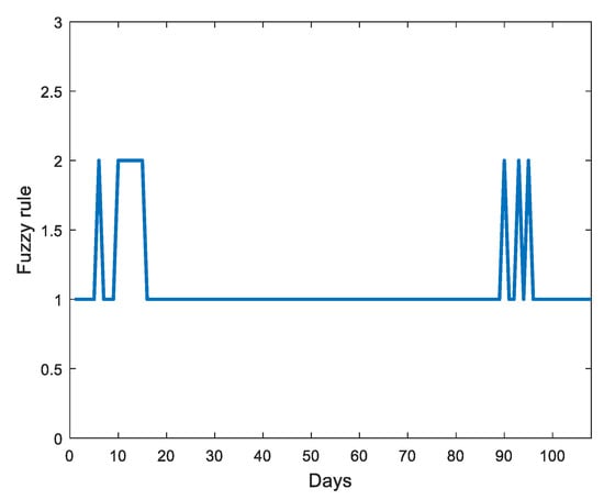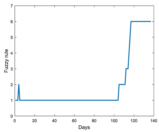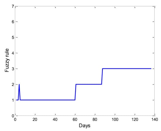 The evolving and adaptive characteristic of PANFIS is illustrated in Figure 8, where it shows the fuzzy rule evolution of PANFIS in the kurtosis feature prediction. PANFIS starts its learning process from no existing rules until the fuzzy rules are automatically created and pruned during the process in accordance with the novelty of data streams. PANFIS responds to changing characteristics of the system on a timely basis, where it introduces a new rule at t = 88 when there exists a “spike” in the kurtosis feature.