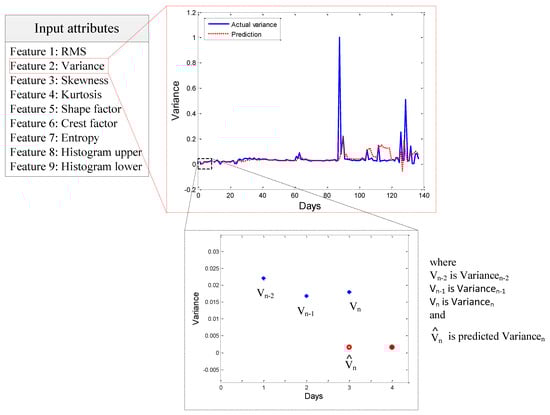 The time-series mode aims to deliver one-step-ahead prediction based on the previous two consecutive data samples . The progression of the slew bearing wear is traced by the predictive model. All samples are fed to the training process and the predictive quality is evaluated by the training error, which pinpoints to what extent the predictive model learns given training representation. A schematic illustration of variance feature prediction based on PANFIS time-series mode is presented in Figure 9.