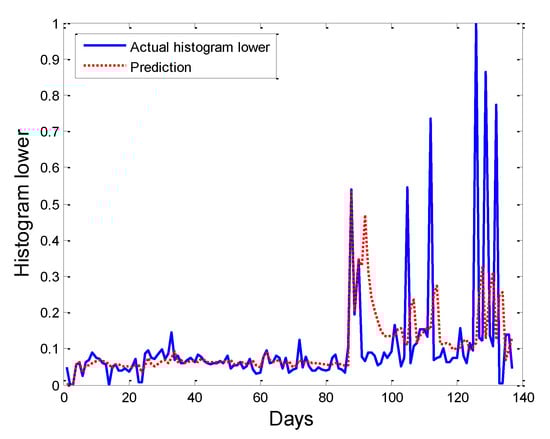 This rule is more readable than (20) because each fuzzy set corresponds to a specific linguistic label. This fuzzy rule is generated under the time-series mode prediction. Another example of PANFIS prediction for histogram lower feature under the time-series mode is presented in Figure 12 and the fuzzy rule evolution is presented in Figure 13.