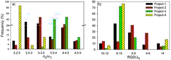 Percentage frequency of (a) intact rock strength (σc) to major principal stress (σ1) ratio (σc/σ1); (b) relative block size (RQD/Jn) for the first four tunnel projects.