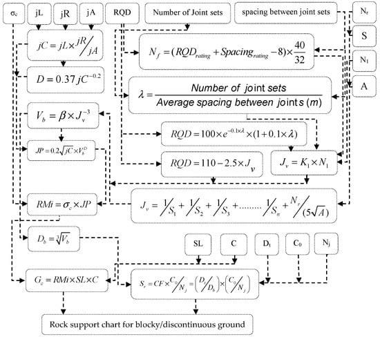 By definition, RMi is the uniaxial compressive strength (UCS) of rock mass, which only includes the inherent features affecting its strength. RMi has various applications in rock engineering, including tunnel support design. After the effective use of RMi in the tunneling field, some significant changes and adjustments for estimating preliminary rock supports by using the block volume and tunnel diameter were made [23]. The stability in blocky (jointed) ground is mainly influenced by the block size and shape, the shear strength of the joints delineating the blocks, and the orientation of the same joints relative to the tunnel axis. For the support application, RMi and tunnel span were adjusted based on the ground condition factor (Gc) and the size ratio factor (Sr), respectively, using Equations (13) and (14), as shown in Figure 4. The support parameters, which include all of these features, are used in the support chart.