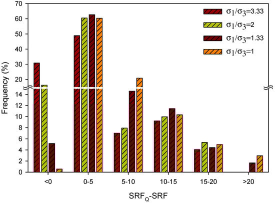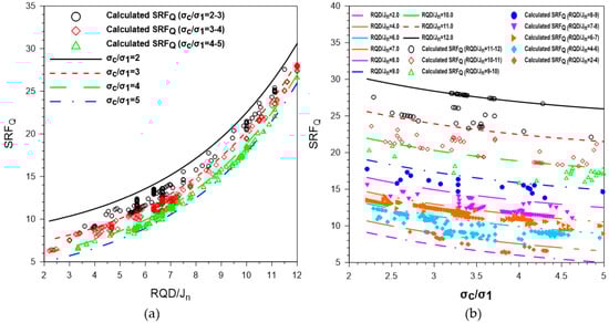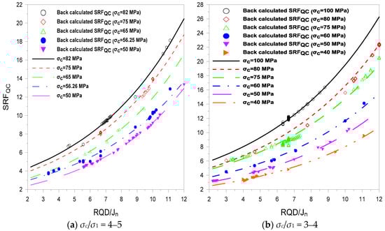 Equations (3) through (7) are for the SRF characterization of Equation (1); therefore, the back-calculated SRFQ values are compared with them. For the given values, Equation (4) gives a higher value of SRF than Equation (5). This exponential Equation (4) agreed with Barton for the calculation of SRF in highly stressed jointed rock mass [53]. The second part of Equation (5) has a negligible effect on the SRF value for σc/σ1 < 5. SRF was calculated from Equation (4) for different field stress ratios, and the details of the differences compared with back-calculated SRF (SRFQ) values are shown in Figure 5.
