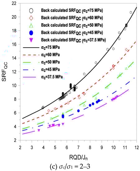Figure 7 shows that the variation of SRFQC with RQD/Jn also depends on σc as well as σc/σ1. For the same value of σc/σ1, high principal stress (σ1) requires rock with a high σc value. The high level of stress means that more support is required, and hence, a high value of SRFQC. The maximum variation of SRFQC with RQD/Jn is 18.5 for σc = 100 MPa, with σc/σ1 ranging from three to four (Figure 7b), and the minimum variation is 7.38 for σc = 37.5 MPa (Figure 7c). During the design stage of a tunnel, when inadequate information exists, then, with knowledge of σc (which is the most basic parameter to be determined) and the location of the tunnel, Figure 7 can be used to approximate values of SRFQC for different values of RQD/Jn. In the construction phase of a tunnel, when most of the information is in hand at the excavation face, Equations (22) and (23) can be used to calculate SRFQC. The maximum rating of σc is 100, as shown in Table 3; therefore, the calculated SRFQ and SRFQC have the same value for tunnel sections where σc = 100 MPa. In the remaining sections, SRFQC < SRFQ, and the difference depends on σc.