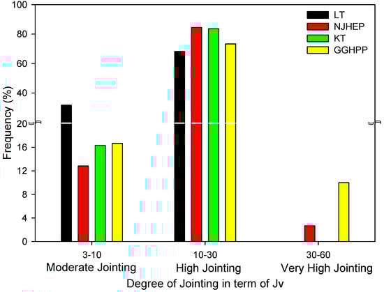 Based on Jv, the degree of jointing is classified into six classes, from a very low degree of jointing (Jv < 1) to crushed rock (Jv > 60). Random joints may represent a significant part of the total number of discontinuities, and neglecting them would lead to the erroneous quantification of the discontinuity nature of the rock mass [48]. A rule of thumb for the calculation of Jv is given in Equation (16) [49]: