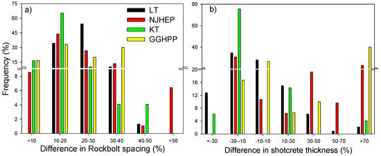 A back-analysis procedure for the Q-value calculation of rock mass, as shown in Figure 3, was suggested using the installed rock bolts and fiber-reinforced, sprayed shotcrete [46]. The back-calculation is explained through Example 1 for the calculation of the Q value. The latest support chart of the Q system [19] is used for the back-calculation for all of the sections of the four projects. The support chart indicated that the shotcrete thickness is a function of De, in addition to the rock quality (Q or Qc); however, rock bolt spacing (Sb) is a function of rock quality only. This spacing of rock bolts was used for the back-calculation of the tunneling quality index (Q1). The thickness of the fiber-reinforced shotcrete is a function of the tunnel span and the tunneling quality index. The thickness of the fiber-reinforced shotcrete, along with the tunnel span, was also used for the back-calculation of the tunneling quality index (Q2). The De is the ratio of tunnel width/span and the excavation support ratio (ESR). The ESR value depends on the country safety standards [20] as well as on the quality of the rock mass [19]. The relation of rock bolt length (Lb) to De for hydropower tunnels, i.e., Project 2 and Project 4, reveals that a value of one for ESR is an appropriate rating for headrace tunnels, and was also used in this study.