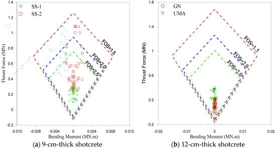 Capacity diagrams, which graphically represent the relationships between thrust-bending moments and thrust-shear forces, are used to evaluate the stability of liners [55]. For this, the structure’s liner information was obtained from the utility function command. Based on the proposed shotcrete thickness from Table 10, thrust-bending diagrams were plotted (Figure 11) for shotcrete thicknesses of 12 cm and 9 cm for factor of safety (FOS) values equal to 1.5, 2, and 2.5.