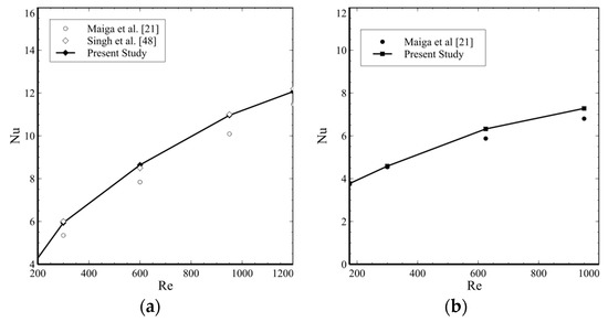 An extensive number of numerical simulations were performed to determine the HTC enhancement of laminar nanofluids. For validation purpose, the present results of the Nu for straight tube were compared with the correlation () of Maïga et al. [21] and the computational results of Singh et al. [48] for constant heat flux condition. Figure 1a shows a good agreement of the present results with the literature [21,48] for water-based Al2O3 nanofluid at = 1%. The Nu results were also validated for constant wall temperature condition as shown in Figure 1b. It may be noted that there is a good agreement between the present results and results predicted by Maïga et al. [21] (), for the Al2O3-water based nanofluid with = 4%.