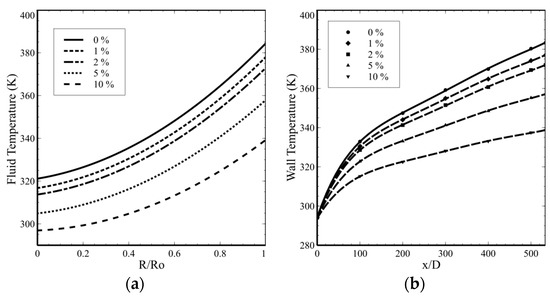In the first case, water-based nanofluids with the constant wall heat flux ( = 10,000 W/m2) were considered. Figure 2 shows the results for the fluid temperature in the radial direction and the wall temperature at the constant values of Re = 500 and To = 293.15 K. It may be noted from Figure 2a, that the fluid temperature decreases with an increase of the nanoparticle concentration from 0 to 10%, especially near the tube wall, suggesting a higher heat transfer rate (above 10%) with nanoparticles.
