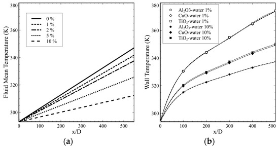 Figure 3 shows the effect of nanoparticle concentration on the fluid mean temperature and wall temperature in axial direction. It may be noted from Figure 3a that the fluid mean temperature decreases with an increase in the value of . The decrease in the fluid mean temperature is caused mainly due to the higher thermal conductivity (up to 32%) of the Al2O3-water nanofluid. The radial, wall and fluid mean temperatures demonstrate that Al2O3-water nanofluid offers a higher thermal capacity as compared to the water. It may also be observed that at the higher thermal conductivity, the wall-to-fluid heat transfer is more important as it augments the heat transfer rate. Three nanoparticles (Al2O3, TiO2 and CuO) with two different concentrations ( = 1% and = 10%) were considered to investigate the thermal efficiency of the nanofluids with increase in the particle concentrations as shown in Figure 3b.