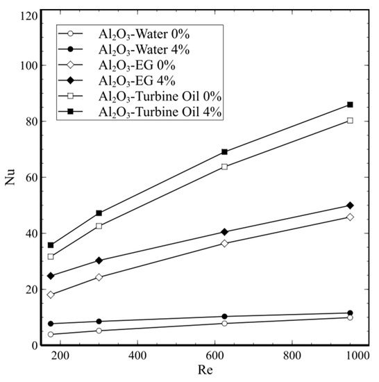 Figure 14a shows the effect of the different type of nanoparticles for a water-based nanofluid. The Al2O3-water nanofluid has a better heat transfer enhancement as compared to that of all the other nanoparticles due to the higher thermal conductivity. Figure 14b shows the Nu for different fluids at the same Re = 950. The turbine oil-based nanofluid has the higher Nu, however it is not the nanofluid with the higher enhancement.