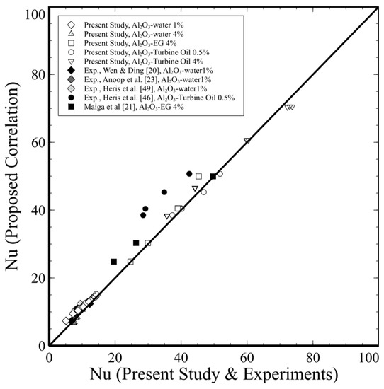 Figure 8 shows the comparison between the present computed Nu results, the experimental results and the computed data from the literature with the present proposed correlation (Equation (13)). It may be observed from Figure 8 that the present results of Nu are in good agreement with the experimental results developed by Wen & Ding [20], Anoop et al. [23], Heris et al. [46], Heris et al. [49] and with the computational results from Maïga et al. [21].