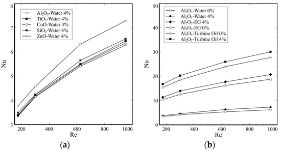 Comparison of Nu for: (a) Al2O3-water, TiO2-water, CuO-water, SiO2-water and ZnO-water and at = 4%; (b) Al2O3-water, Al2O3-EG and Al2O3-turbine oil at = 4%.
