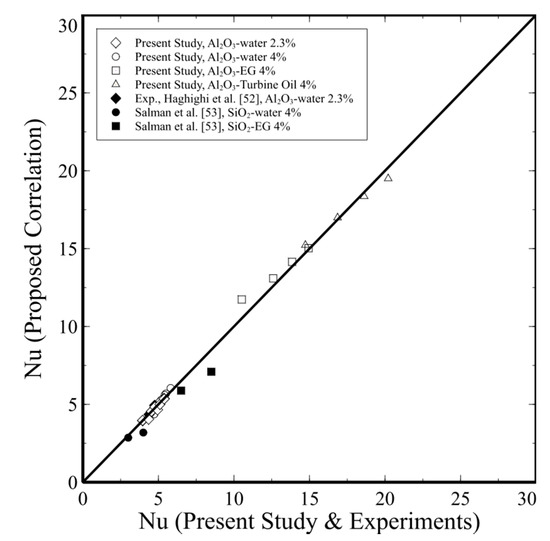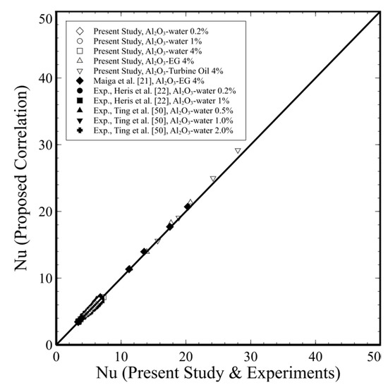 For the average Nu in a straight tube with constant wall temperature a new correlation (Equation (14)) is proposed by fitting the data obtained from the numerical simulations. The correlation covers a wide range of the nanoparticle concentration (0% ≤ ≤ 10%) and Prandtl number (6.0–500) under the laminar flow condition (25 < Re < 1500). Figure 11 shows the comparison between the present computed Nu results, with the experimental results from Heris et al. [22], Ting et al. [50] and the computed data from Maïga et al. [21] with the present proposed correlation (Equation (14)). A good agreement was attained between the computed and previous experimental work with the predicted values of the Nu with a variation of ±5%.