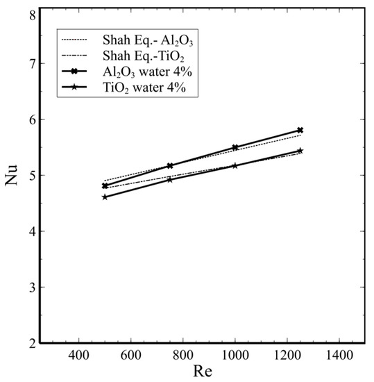 In case 5, all the different nanofluids Al2O3-water, TiO2-water, CuO-water, SiO2-water and ZnO-water are used to investigate the Nu in a straight microtube with a length of 0.3 m and an inner diameter (dt) of 0.5 mm. Results from the numerical simulation were compared with Shah’s [51] correlation (Equation (15)) for validation purpose. A good agreement can be seen in between the present computed results of Nu with the predicted values from Shah’s correlation, as shown in Figure 12.