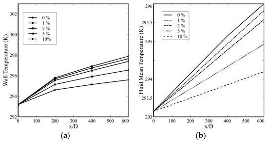 It may be noted from Figure 13a,b that similar to the straight tube results, the wall temperature as well as fluid mean temperature in the straight microtube also decreases with increase in the nanoparticle concentration. The decrease in the temperatures of the wall and the fluid will result in a better heat transfer.
