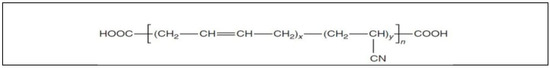 The tracer was required to be both compatible with the bitumen and distinguishable from the bitumen without affecting its characteristics. CTBN (Lanzhou Petrochemical Co., Ltd., Lanzhou, Gansu, China) was utilized as the tracer; the chemical formula of CTBN is shown in Figure 1. The density of CTBN is 0.950 g/cm3, which is nearly the same as that of bitumen. In addition, CTBN is highly compatible with bitumen and does not produce a chemical reaction.