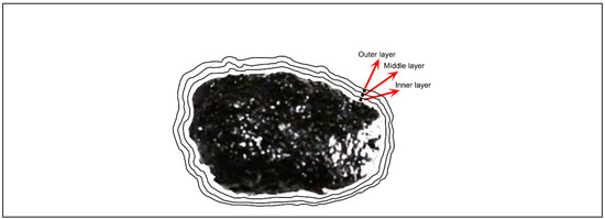A Vector 33 FTIR spectrometer and infrared microscope (Bruker, Ettlingen, Baden-Wutenberg State, Germany) were used for the analysis. Bitumen samples for the FTIR test were first heated by a thermal radiative lamp. The softened bitumen was then evenly poured onto KBr disks, and the FTIR tests were performed by the Vector 33 FTIR spectrometer. For the asphalt mixture, samples were scraped from the asphalt mixtures at randomly selected locations. The samples were taken using a microscope to obtain stratified samples accurately. Since the asphalt film thickness levels of asphalt mixtures are different in different locations, samples were scraped from outside to inside continuously until reaching the surface of the aggregate, and the scraped asphalt film samples were then evenly divided into three parts according to the sampling total depth. These parts were separated to the outer layer sample, the middle layer sample, and the inner layer sample. Because the depth of manual sampling is difficult to control accurately, multi-point sampling was used for statistical analysis to improve the representativeness of the stratified sampling. The sampling scheme is illustrated in Figure 2. The samples were placed on the microscope stage, and the infrared spectrum of each sample was obtained.