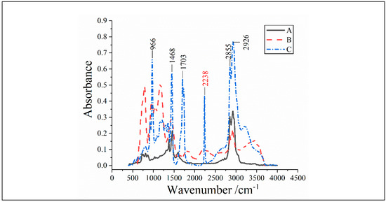 The infrared spectra of the CTBN, RAP and virgin bitumen simples are shown in Figure 3, where A indicates virgin bitumen, B indicates RAP, and C indicates CTBN. The peak at 966 cm−1 is attributed to the bending vibration of C–H in the double bonds of butadiene (–CH=CH–). The peak at approximately 1468 cm−1 corresponds to the bending vibration of the –CH2 group, whereas the peaks at 2855 cm−1 and 2926 cm−1 are ascribed to the symmetric and antisymmetric vibrations, respectively, of –CH2 groups [24,30].