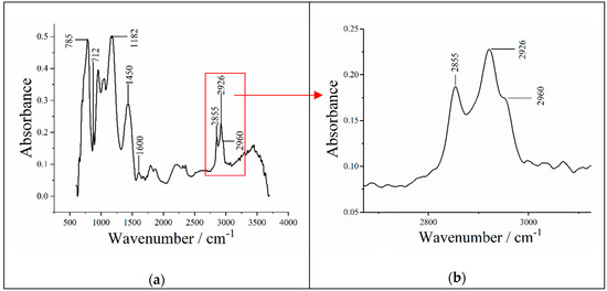 The chemical formula of CTBN and the absorbance peaks in Figure 3 indicate that CTBN does not possess a –CH3 group, and the bond of the –CH3 vibrations is steady during the aging process [26]; therefore, the characteristic absorption peaks of the –CH3 group (at 2960 cm−1, 1460 cm−1 and 1375 cm−1) can be used to distinguish the bitumen from CTBN. Figure 4a displays the spectrum of RAP; the absorption peaks at 1460 cm−1 and 1375 cm−1 are obscured by the strong absorption peaks of the mineral powder and aggregate, indicating that the absorption peaks at 1460 cm−1 and 1375 cm−1 cannot be used as characteristic absorption peaks. Meanwhile, since the infrared spectrum of RAP (Figure 4b) exhibits a characteristic absorption peak at 2960 cm−1, which is attributed to the antisymmetric vibrations of –CH3 groups, the peak at 2960 cm−1 was chosen as the characteristic absorption peak of the bitumen.