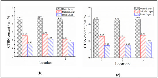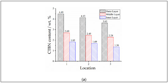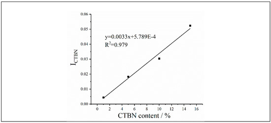 Considering that the absorption peak intensity is influenced by the thickness of the sample film covering the KBr table, the structural indices of the chemical functional groups were used to semi-quantitatively analyze the proportions of CTBN in the samples for the sake of avoiding any effects associated with the film thickness. Following Wang et al. [26], the structural indices considering the area of chemical functional groups can be calculated by the following equation:
