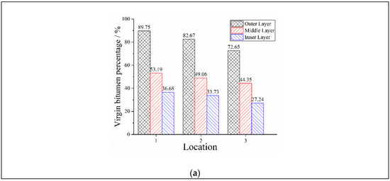 Figure 8 shows that the virgin bitumen percentage in the outer RAP layer was higher than that found in the case of complete blending (55.88%), indicating that the RAP film was wrapped by the virgin bitumen and that the RAP binder was completely blended with the virgin bitumen. With an increase in the RAP film depth, the percentage of virgin bitumen in the RAP decreased. The virgin bitumen percentage in the middle RAP layer was slightly lower than that in the case of complete blending, which indicates that the virgin and RAP binders were not completely blended, but were still blended relatively well. Meanwhile, although some virgin bitumen contributed to the blending of the virgin and RAP binders within the inner layer of the RAP film, the percentage of virgin bitumen was only approximately half of that in the case of complete blending. This means that the blending degree of virgin and RAP binders was very low, and the inner layer of the RAP film was mainly composed of the RAP binder. These results suggest that the blending of virgin and RAP binders occurs in RAM with high percentages of RAP, but this blending is incomplete. Although the virgin and RAP binders did completely blend together within the outer layer of the RAP film, the blending degree decreased with an increase in the depth of the RAP film. In summary, the virgin and RAP binders did not effectively blend, and the blending degree was relatively low within the inner layer of the RAP film, which may significantly affect the pavement performance of the RAM.