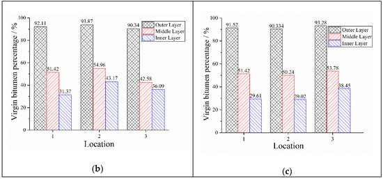 Percentages of virgin bitumen at different depths of RAP in the recycled asphalt mixtures (RAM): (a) RAP specimen 1; (b) RAP specimen 2; and (c) RAP specimen 3.
