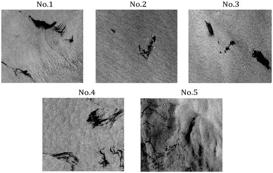 Five SAR oil slick scenes acquired by Radarsat-2 (fine quad-polarized mode) are described in Table 1, and some information on those data (e.g., wind direction, water temperature, etc.) is described in detail in Guo’s studies [19]. Radarsat-2 images of the Mexico Bay area (No.1 and No.4) were acquired on 8 May 2010 and 24 August 2011, respectively. The dark spots in Figure 1 were interpreted as crude oil. North Sea of Europe area data sets (No.2 and No.3) were acquired from 6–9 June 2011. There are three substances (i.e. crude oil, oil emulsion, and plant oil) in the two scenes, and the acquisition interval of No.2 and No.3 was about 12 hours. The data No.5 was obtained in the South China Sea on 18 September 2009. The experimental data contain a small amount of crude oil and plant oil, which were poured with 15-minute intervals.